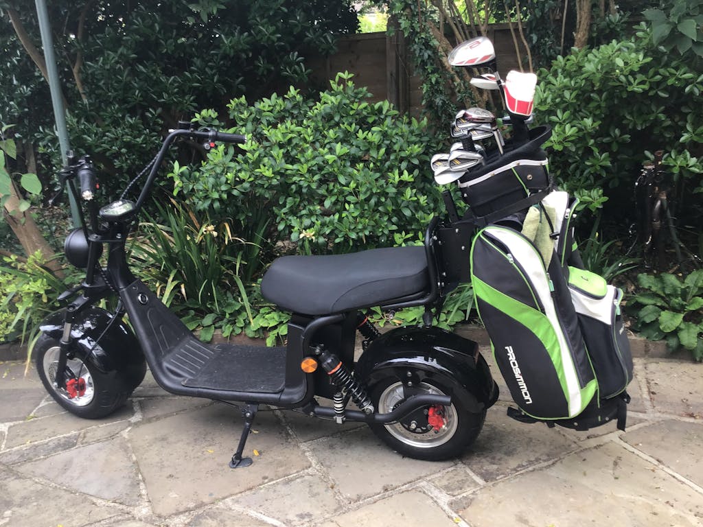 Hi Luke, I have made my own golf bag carrier and fitted to scooter out of bits from an old golf trolley and a bit of sheet metal, as it’s not necessary to able to see the lights at the back on the golf course it enabled me to put it at a lower level which I prefer. The scooter runs very well over the ground, but can be a bit difficult to park on slopping ground , I would suggest a double legged stand might be an improvement .