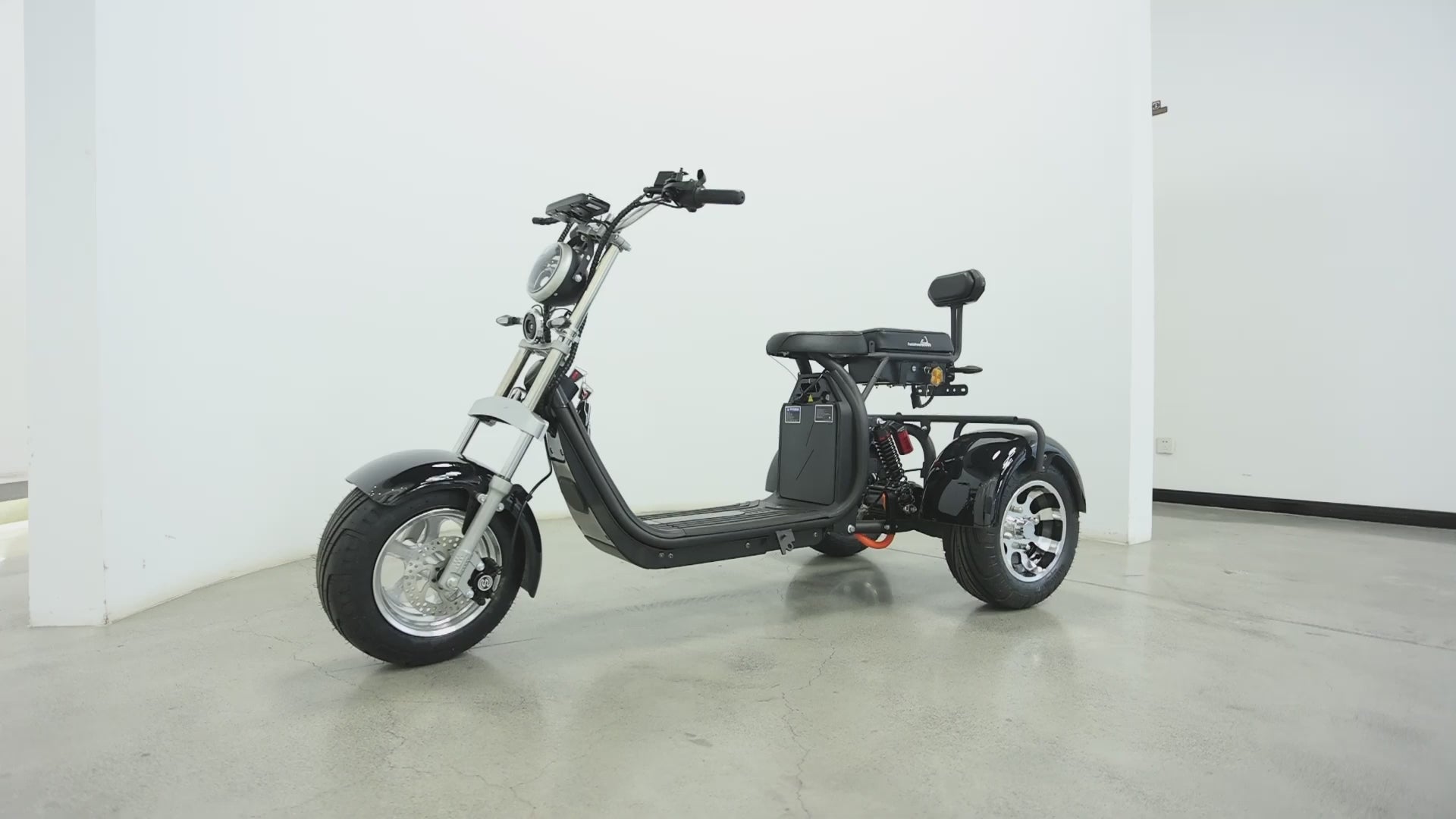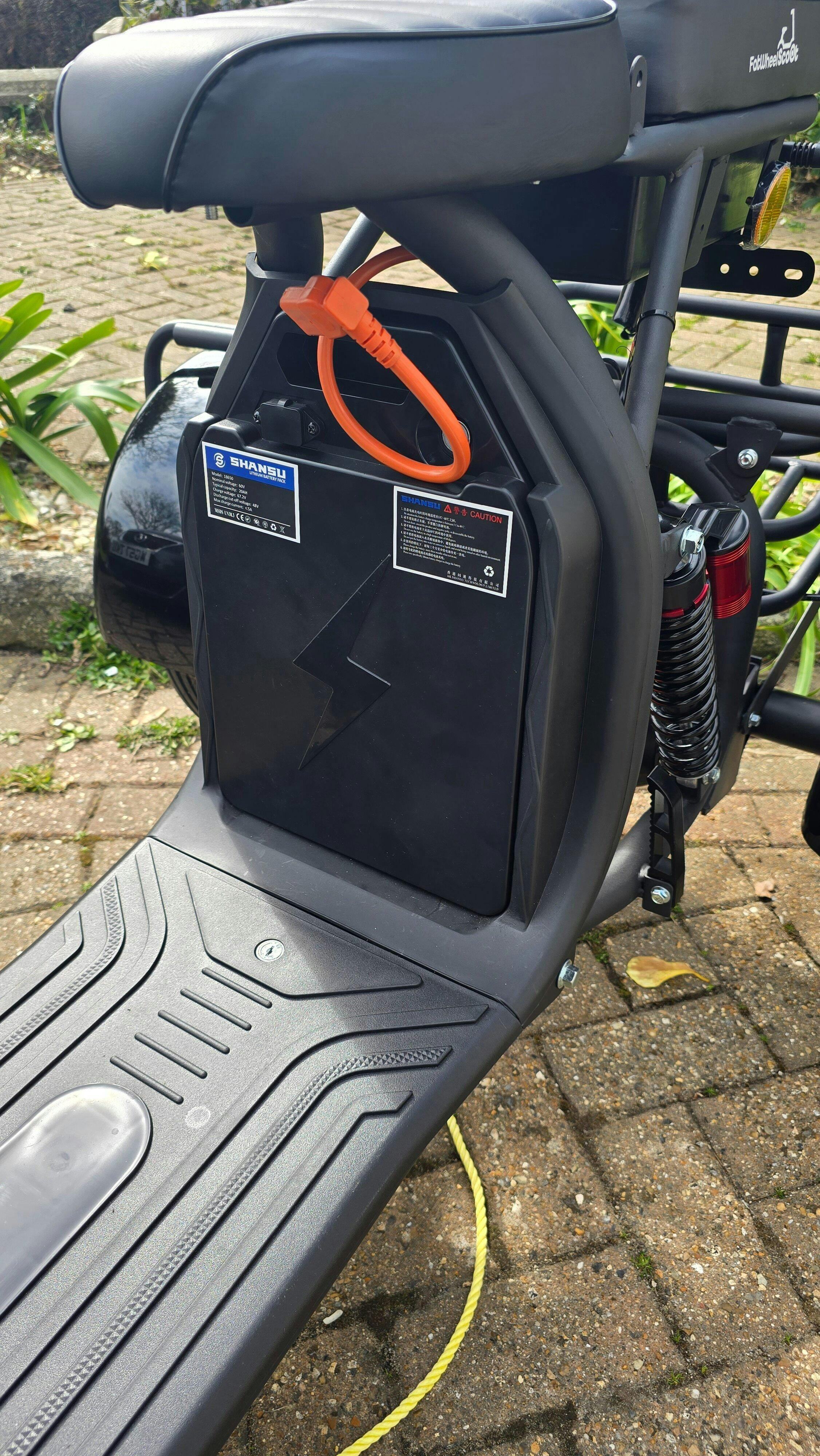 There is a lockable storage space beneath the tricycle's base (which can house an additional battery). The additional battery doubles the range of the tricycle to 40 miles.
