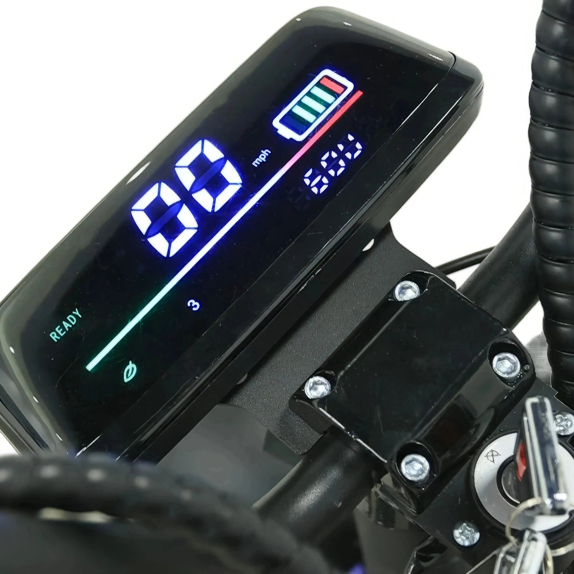 Fully equipped with the features that make your life comfortable. Front and rear suspension, front and rear lights, mirrors, indicators, horn, speedometer and battery indicator.