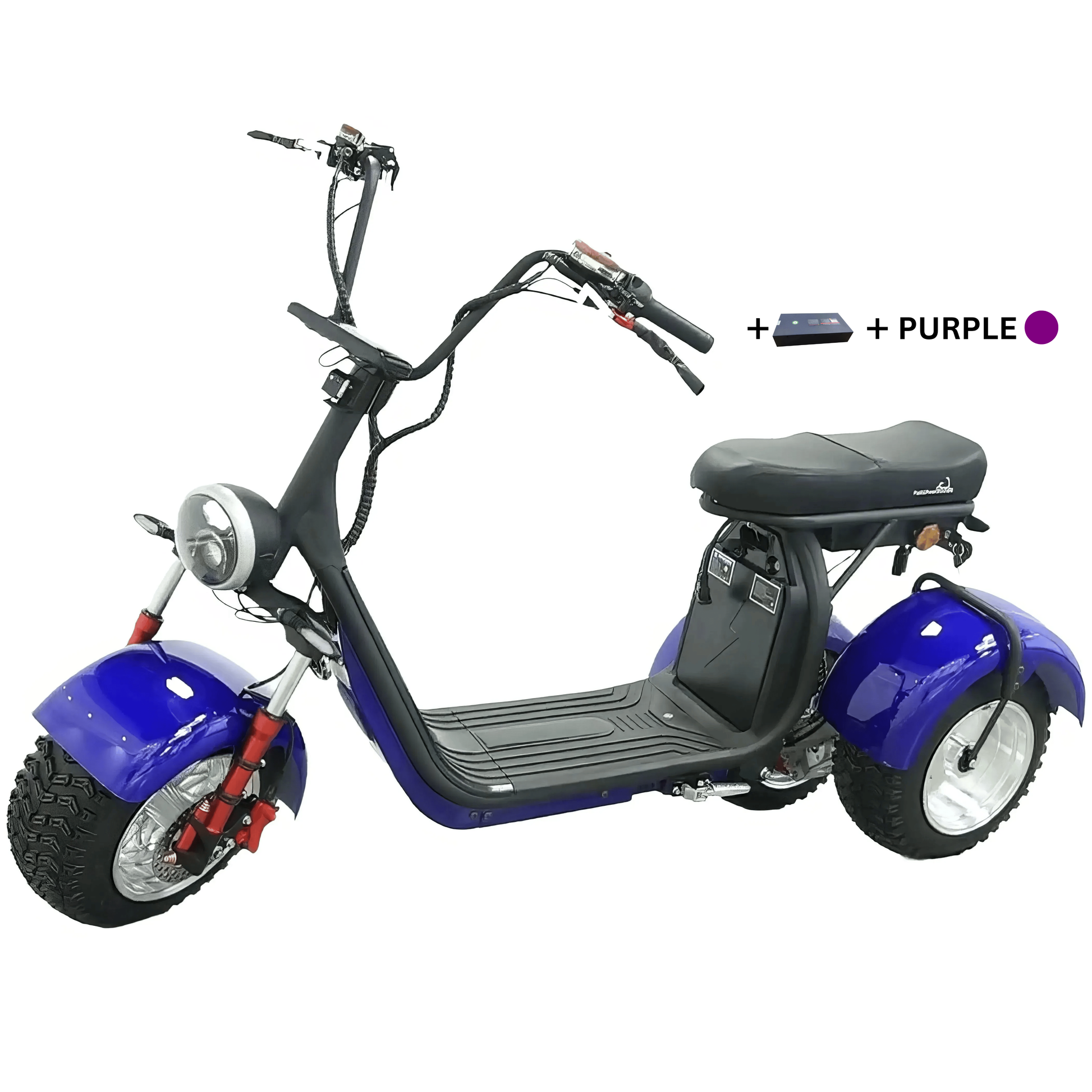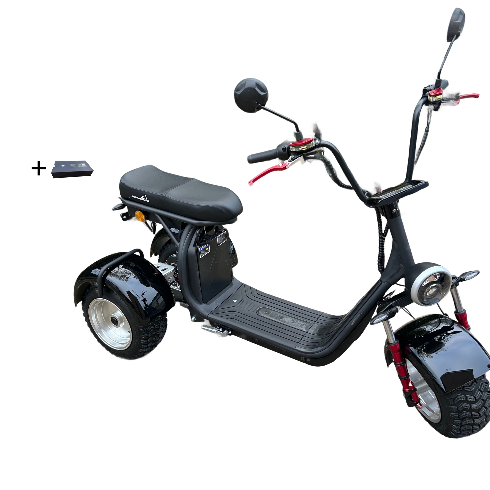 There is lockable storage space beneath the tricycle's base (which can house an additional battery). The additional battery doubles the range of the tricycle to 38 miles.