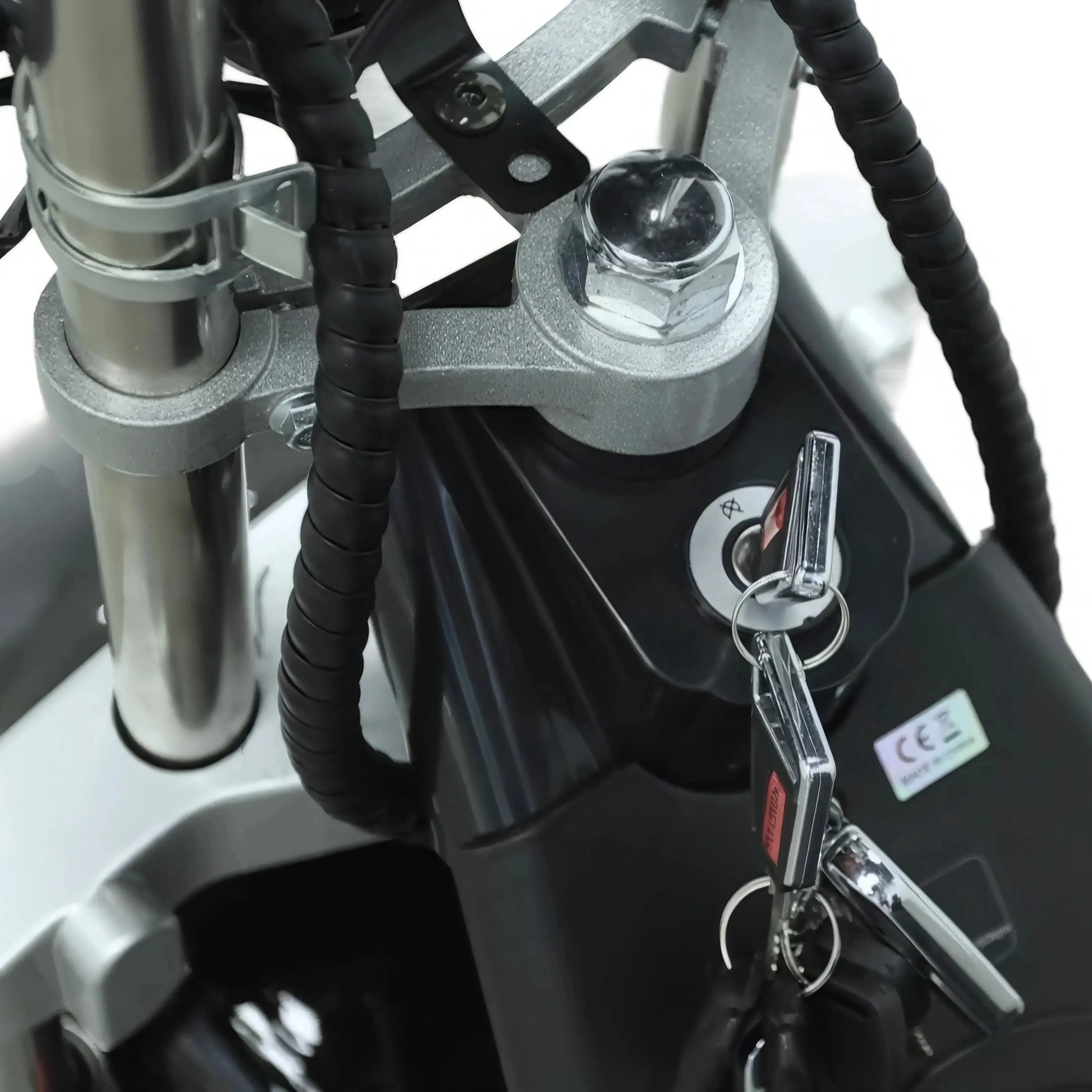 The scooter is well protected, with a key required to start or access the battery or storage space. It also has an alarm, which can be armed and disarmed by the included key fob.